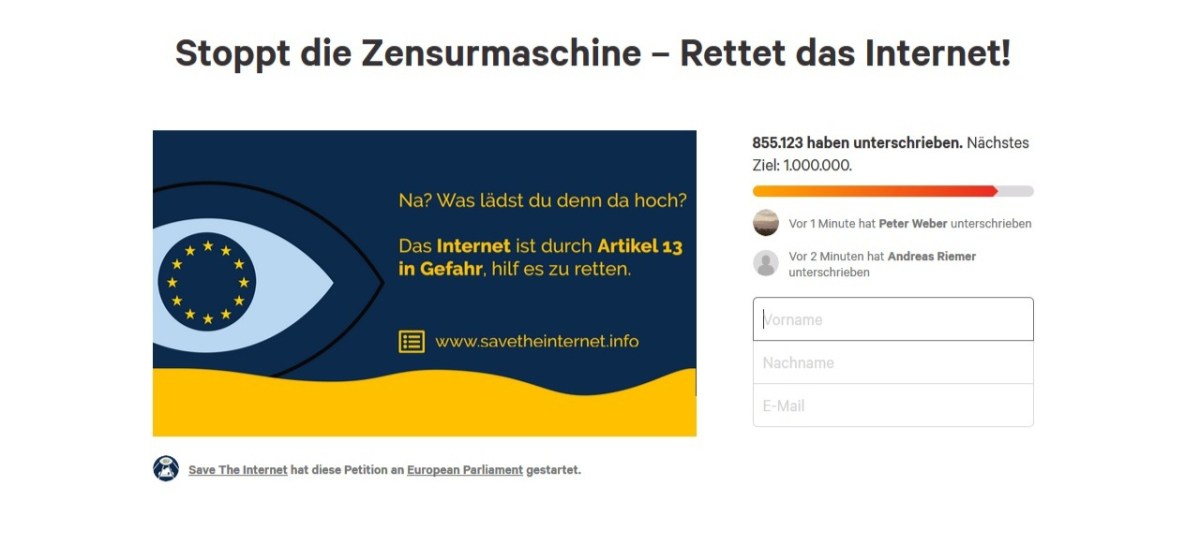 Auszug aus der Petition zum Upload-Filter: „Die Umsetzung des 13. Artikels hat eine komplette Echtzeitfilterung der Inhalte, die künftig im Netz hochgeladen werden, zur Folge. Letztlich bedeutet das: Jedes Datenpaket wird in Zukunft von einem potentiell fehleranfälligen Algorithmus automatisiert geprüft werden. Dies ist vergleichbar mit dem fehlerhaften Algorithmus von YouTube, bei dem häufig auch fälschlicherweise Inhalte gelöscht werden, welche nicht urheberrechtlich geschützt sind.