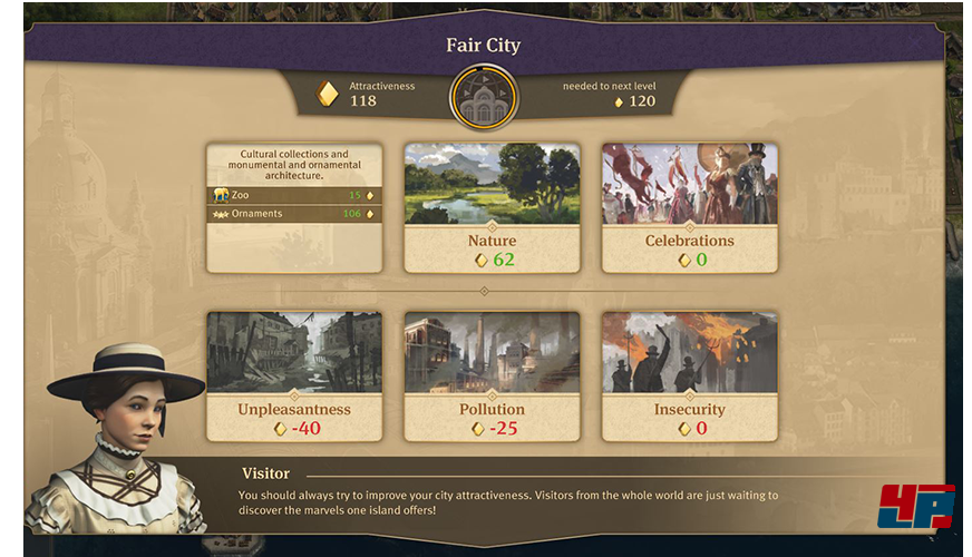 Deshalb wird in ANNO 1800 die „Städte-Attraktivität“ eingeführt. Jede Insel wird mit diesem Attraktivitätssystem bewertet und je nach Bewertung gibt es Auswirkungen auf verschiedene Spielaspekte. Insgesamt gibt es sechs verschiedene Kategorien nach denen die Gesamtattraktivität der Insel bemessen wird. Drei positive Kategorien (Kultur, Natur, Feierlichkeiten) können helfen, die Attraktivität der Insel auf die nächste Stufe zu heben, während drei negative Kriterien (Geschmacklosigkeit, Verschmutzung, Unsicherheit) dazu beitragen können, dass die Stadt an Attraktivität verliert. Je attraktiver eine Stadt ist, umso mehr Touristen werden zum Beispiel angezogen. Die drei positiven Aspekte stellen die Entwickler bei ANNO Union folgendermaßen vor.