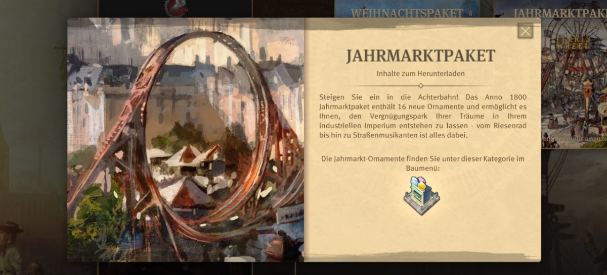 Für Anno 1800 ist das kosmetische Jahrmarktpaket für 4,99 Euro veröffentlicht worden. Es umfasst 16 Ornamente, darunter eine Achterbahn, die das bisher größte Ornament in der Anno-Reihe sein soll.