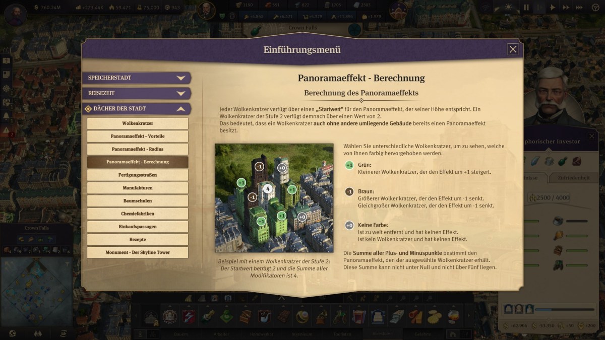 Auch der Panorama-Effekt ist eine neue Buff-Mechanik, die für die Wolkenkratzer gilt. Wolkenkratzer erhalten einen Bonus, wenn sie neben einem Hochhaus stehen, das nicht ganz so hoch ist. Dieser Bonus hat mehreren Stufen (intensiv, stark, solide, mäßig, schwach, keiner), verringert die Unterhaltskosten, erhöht die maximale Anzahl der Bewohner und sorgt für Bonusbewohner, wenn die Bedürfnisse gut erfüllt sind.