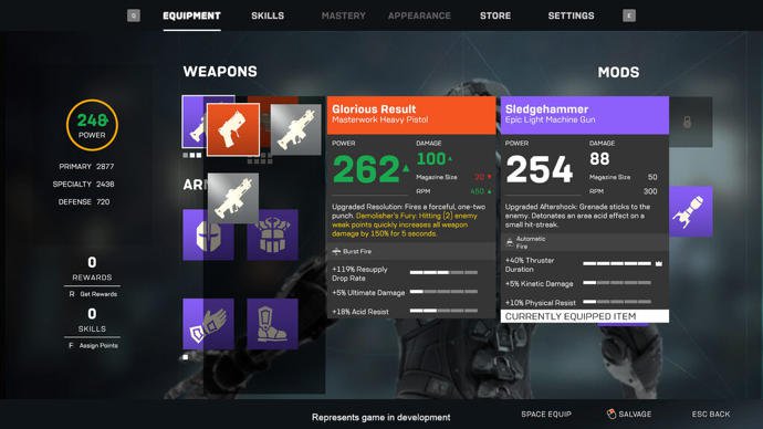 na hoffentlich schaut man sich nicht zuviel bei destiny ab. das balancing ist nämlich komplett für die tonne und die waffen lassen sich klassenübergreifend auch nicht vergleichen, weil es zwar überall leisten, aber keine konkreten zahlen gibt. das gleiche problem bei den mods. welche werte werden wie stark gesenkt oder erhöht und was stackt mit wem? geht den spieler scheinbar nichts an. zum glück hat anthem kein pvp. ansonsten war man ja schon auf dem richtigen weg. einen gesamtscore wie beim lichtlevel gab es ja schon. die waffen und skills und anzüge waren interessant, weil sie sich wirklich unterschiedlich gespielt haben. das sollte man mit blick auf die breite palette von mass effect weiter ausbauen. des weiteren kann man durch neue meisterwerkseigenschaften immer frischen wind ins gameplay und layout bringen. die hauptprobleme waren halt eher das eintönige endgame, die schlechten dropraten (und als sie durch einen fehler gut und alle glücklich waren hat man sie generft) und die limitierte vertikale progression. nächster schwierigkeitsgrade, besserer loot und ab dafür und BITTE KEINE täglichen/wöchentlichen limitierungen des besten loots aus stark eingeschränkten quellen ohne automatisches matchmaking, obwohl es meist auch mit ginge. der screenshot sieht links mit primary, specialty und defense übrigens auch ein bisschen nach the division aus.