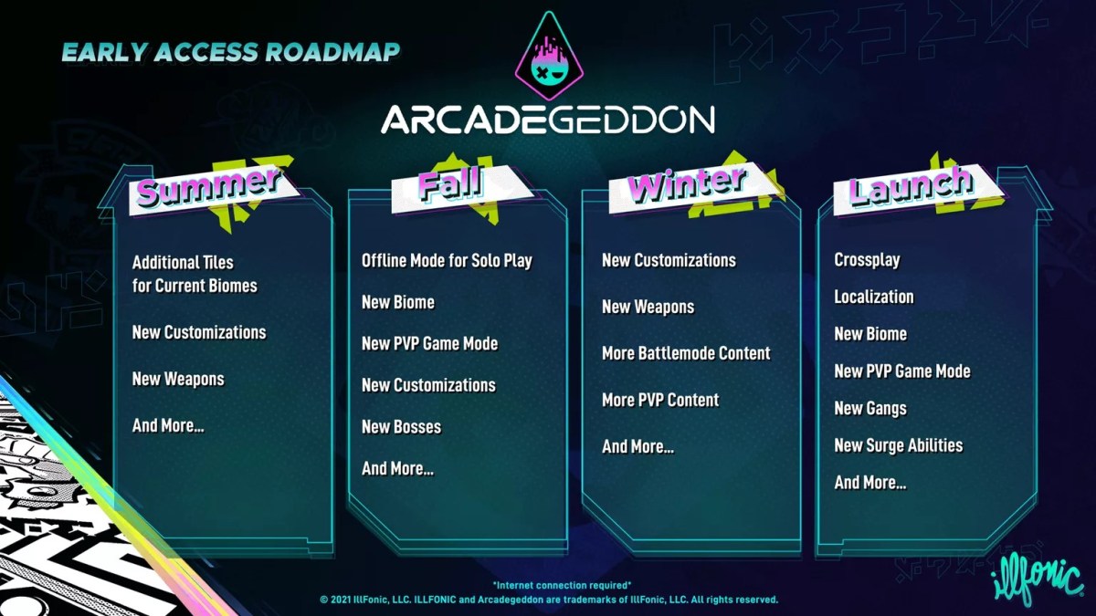Dieser Multiplayer-Shooter, der immer etwas Neues zu bieten hat, lässt euch mit bis zu drei Freunden verschiedene Biome erkunden, Minispiele zocken, verborgene Truhen finden und zahlreiche Gegnertypen und Bosse erledigen. Arcadegeddon ist ein Koop-Multiplayer-Shooter mit einer Mischung aus PvE und PvP, der euch nach eurem eigenen Tempo spielen lässt. Beim Spielen könnt ihr verschiedene Herausforderungen der städtischen ‚Gangs‘ angehen, die in Gilly’s Spielhalle rumhängen. Dabei verdient ihr mehr als nur den Respekt der Straße, sondern auch euren Platz auf der Rangliste.“ Hier die aktuelle Roadmap: