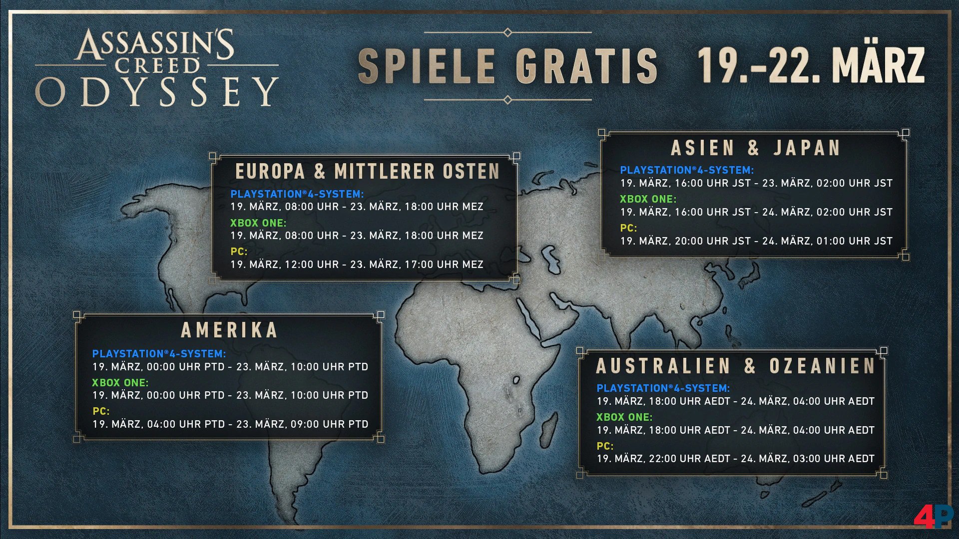 Vom 19. bis zum 22. März kann Assassin’s Creed Odyssey kostenlos auf PC, PlayStation 4 und Xbox One ausprobiert werden (Details). Ein Vorabdownload auf PC (Uplay) und PS4 ist bereits möglich. Während des kostenlosen Wochenendes haben die Spieler Zugriff auf alle Inhalte des Hauptspiels. Ein PS-Plus-Abonnement auf PlayStation 4 und ein Xbox-Live-Gold-Abonnement auf Xbox One sind erforderlich.