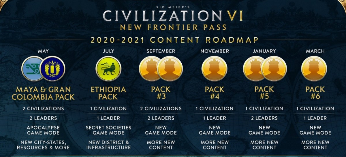Für Civilization 6 ist der „New Frontier Pass“ auf PC, PS4, Switch und Xbox One angekündigt worden (Preis: 39,99 Euro). Der Season Pass umfasst acht Zivilisationen, neun Anführer, sechs zusätzliche Spielmodi und weitere Inhalte für das Strategiespiel. Die Inhalte werden in sechs DLC-Paketen veröffentlicht, die zwischen dem 21. Mai 2020 bis März 2021 im Zweimonatsrhythmus erscheinen werden. Es wird möglich sein, jedes DLC-Paket auch einzeln zu erwerben. Mobile Plattformen werden im Laufe des Jahres versorgt. Für einige DLC-Funktionen sind zusätzlich die Erweiterung Gathering Storm und/oder Rise and Fall erforderlich (Details). Außerdem wollen die Entwickler zwischen den DLC-Paketen auch kostenlose Updates mit neuen Karten, Szenarios, Balance-Anpassungen etc. für alle Besitzer des Spiels veröffentlichen.