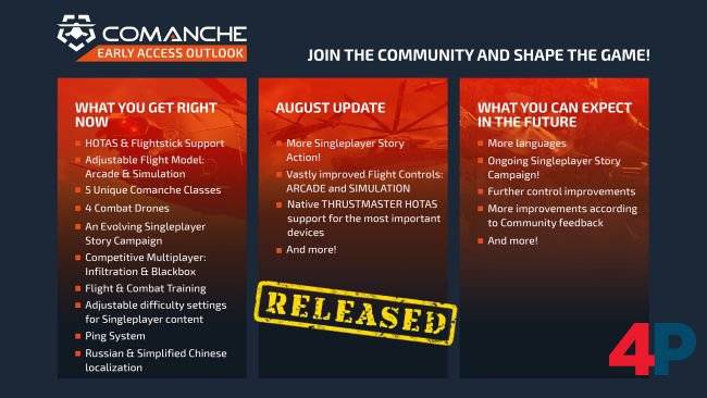 „Unser Ziel im Early Access ist, herauszufinden, was die Spieler von Comanche erwarten“, erklärt Fabian Baumgarten (Producer), „und es ist schnell klar geworden, dass Single-Player-Inhalte und die Steuerung sowie Quality-of-Life-Features ganz oben auf den Wunschlisten stehen“.