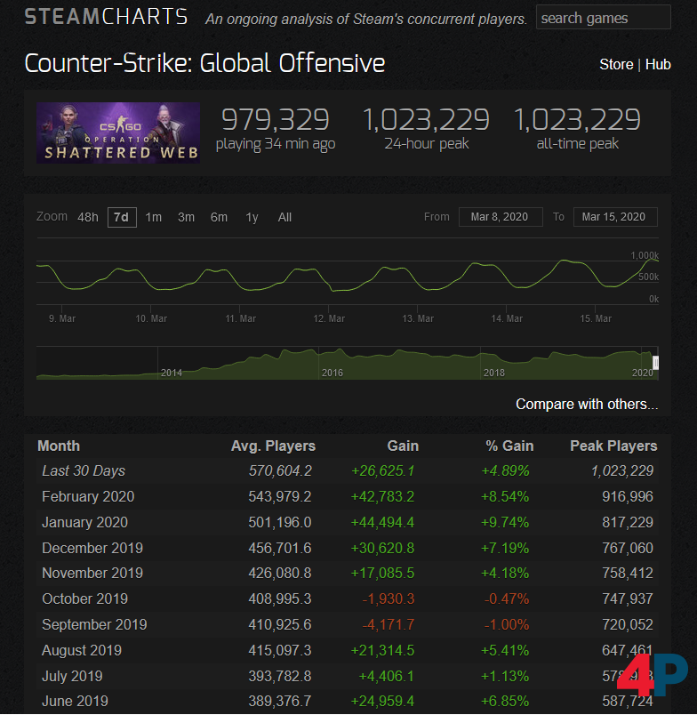 Siebeneinhalb Jahre nach der Veröffentlichung von Counter-Strike: Global Offensive (CS:GO) hat der Multiplayer-Shooter erstmalig die Marke von einer Million gleichzeitig aktiver Spieler auf Steam erreicht. Der Spielerzahlen-Höchststand des kostenlos spielbaren Shooters mit optionalem „Prime Status Upgrade“ war in den vergangenen 48 Stunden 1.023.229 (gleichzeitig aktive Nutzer). Der bisherige Rekord wurde im Februar 2020 verzeichnet (911.000).