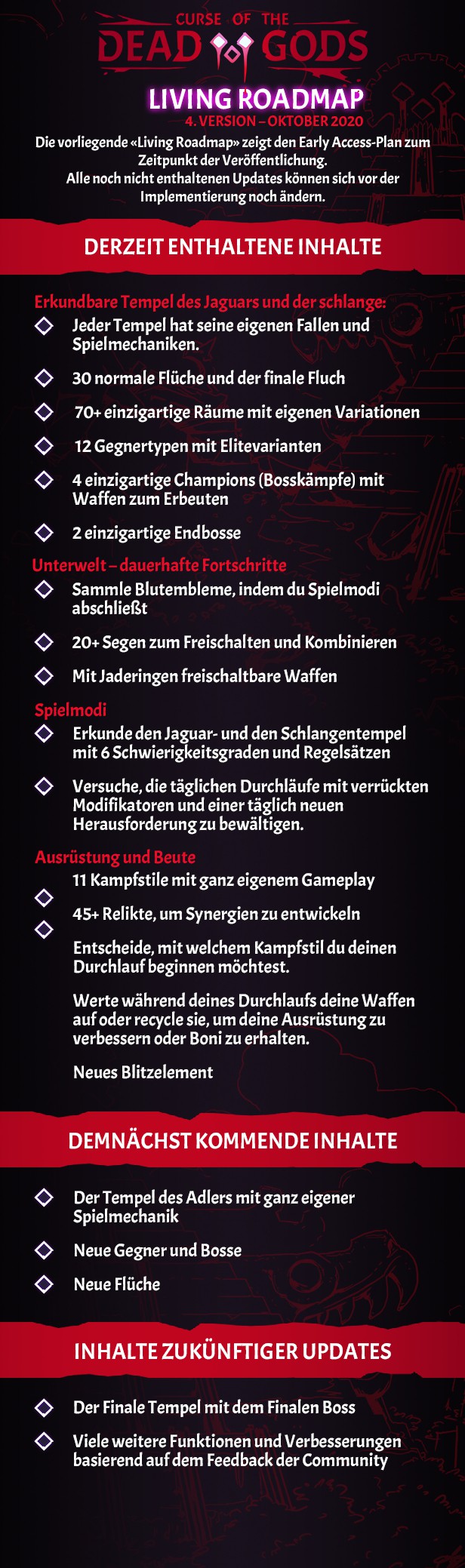 Für die Early-Access-Version von Curse of the Dead Gods ist das große Update „The Armory“ veröffentlicht worden. Abgesehen von neuen Waffentypen ermöglicht das Arsenal als neues Upgrade-System den Spielern, Startwaffen freizuschalten, auszuwählen und sie im Laufe der Partien/Versuche zu verbessern. Mit dem Blitz kommt auch ein neues Element ins Spiel, um Gruppen von Feinden auszuschalten. Mittlerweile gibt es elf Waffen (neu: Peitsche als Sekundärwaffe und Wurfwaffe als Primärwaffe), die den Spielstil bestimmen. Das Change-Log findet ihr hier.