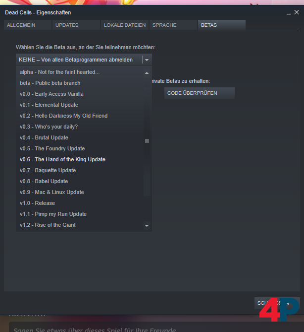 Dead Cells hatte bekanntlich eine längere Early-Access-Phase hinter sich und mit der Zeit hat sich das Spiel stellenweise stark verändert. Aus diesem Grund haben die Entwickler das Legacy-Update veröffentlicht, in dem man gezielt jede „alte Early-Access-Version“ des Spiels im Steam-Beta-Menü auswählen und spielen kann. Das Beta-Menü erreicht man, wenn man mit der rechten Maustaste auf den Spiele-Namen in der Steam-Liste/Bibliothek klickt und den Unterpunkt „Eigenschaften“ auswählt. Ganz rechts steht dann „Betas“.