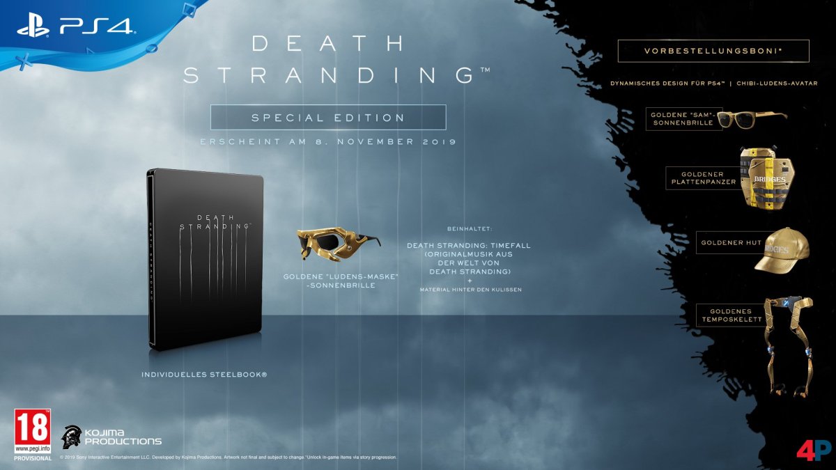 Death Stranding wird in vier verschiedenen Versionen angeboten: Standard Edition, Special Edition, Digital Deluxe Edition und Collector’s Edition. Derzeit können nur die digitalen Editionen im PlayStation Store vorbestellt werden.