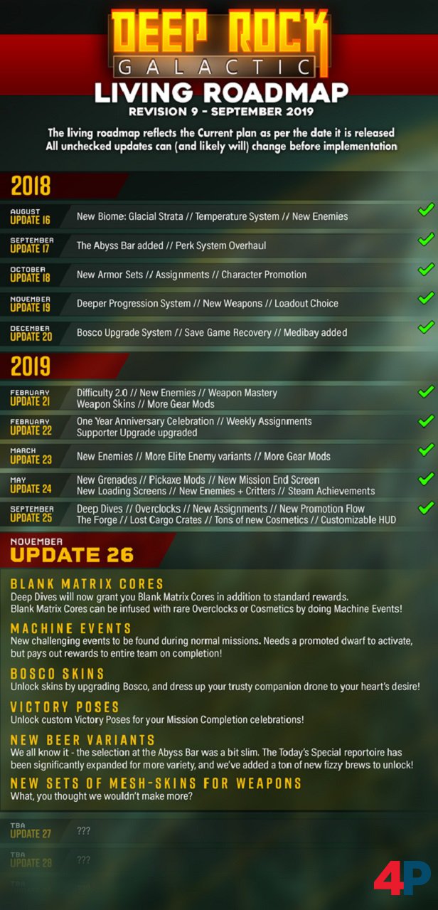 Das Update 26 „Endgame – Part Two“ ist für die Early-Access-Version von Deep Rock Galactic veröffentlicht worden. Mit dem Inhaltsupdate werden „Machine Events“ für die normalen Missionen hinzugefügt, die Bar sowie die Bierauswahl überarbeitet, zahlreiche Balance-Anpassungen vorgenommen und viele Bugs aus der Welt geschafft. Das Change-Log findet ihr hier.
