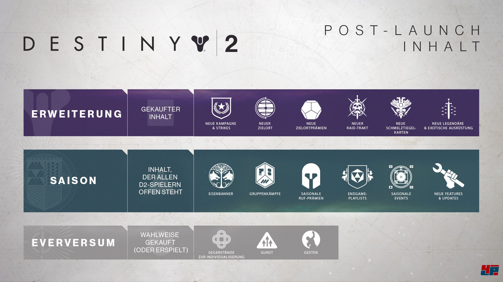 Im gestrigen Development Update ging Christopher Barrett (Game Director) noch näher auf die unterschiedlichen Destiny-Inhaltskategorien ein (kaufbare Erweiterungen, kostenlose Inhalte/Saisons; siehe Grafik) und führte konkreter aus, welche kostenfreien Updates für Destiny 2 in diesem Jahr geplant sind, die allen Spielern zugänglich gemacht werden sollen, egal ob sie eine Erweiterung besitzen oder nicht. Über bessere Beute in den Raids hatten wir bereits berichtet.