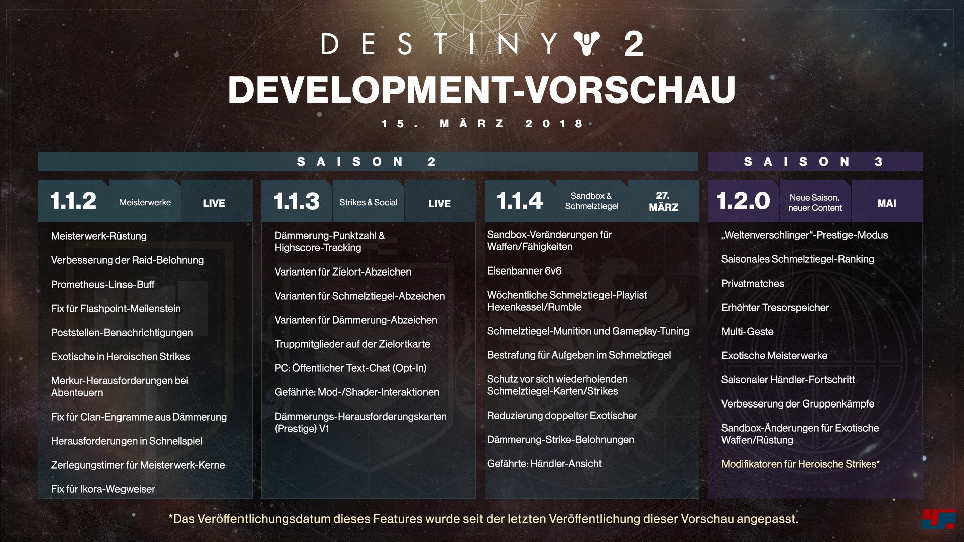 Heute Abend wird der Patch 1.1.4 für Destiny 2 veröffentlicht. Die Wartungsarbeiten an den Servern sollen um 18 Uhr beginnen und um 20 Uhr abgeschlossen sein. Die folgende Grafik gibt einen Überblick über die geplanten Verbesserungen.