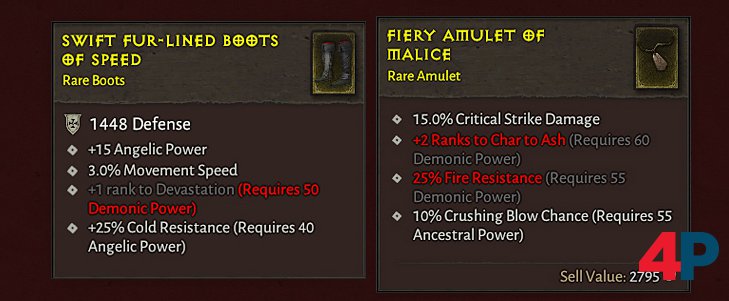 „In diesem Beispiel bräuchtet ihr 50 Dämonenmacht, um für die Fertigkeit Verwüstung einen zusätzlichen Rang zu erhalten, 55 Dämonenmacht für 25 % Feuerwiderstand oder 60 Dämonenmacht, um für die Fertigkeit Verkohlung 2 zusätzliche Ränge zu erhalten. Wenn ihr euren Build auf Schmetterschlag ausrichten wollt, bräuchtet ihr stattdessen mindestens 55 Ahnenmacht und für 25 % Kältewiderstand bräuchtet ihr 40 Engelsmacht.“