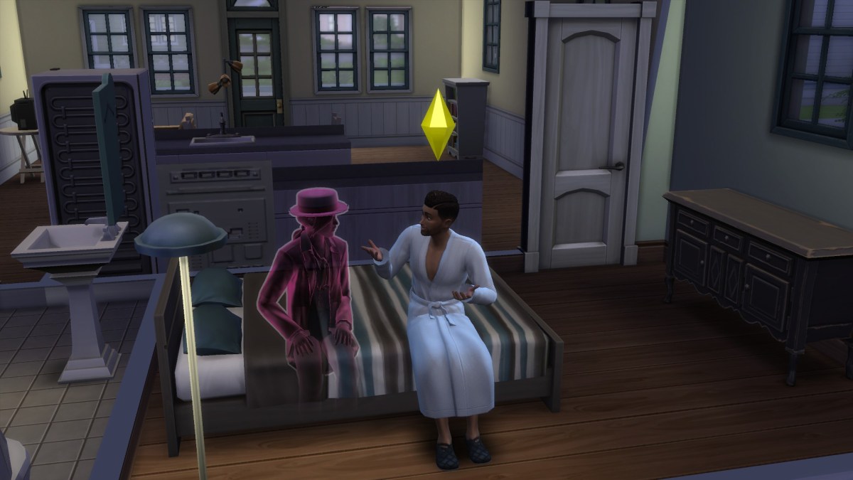 Neu hinzu gekommen sind einige Frisuren und Kleidungsstücke, die mir mit ihrem Boho-Look diesmal etwas zu langweilig für das Geisterthema ausfallen. Im Kaufmodus sind ein paar ganz nette Möbelstücke und Dekorationsobjekte hinzugekommen, aber auch hier hätte ich gerne mehr ikonische Objekte wie ein Ouija-Brett, Kerzen & Co. gesehen. Der coolste neue Gegenstand ist der Séance-Tisch, mit dem man sich zum fähigen Medium aufleveln und mit den Toten in Kontakt treten kann. Alleine oder in der Gruppe kann man Séancen abhalten, was ziemlich lustig zu beobachten ist. Irgendwann ist es auch möglich, dunkle Rituale auszuführen und sich damit kurzzeitig selbst in einen Geist zu verwandeln.