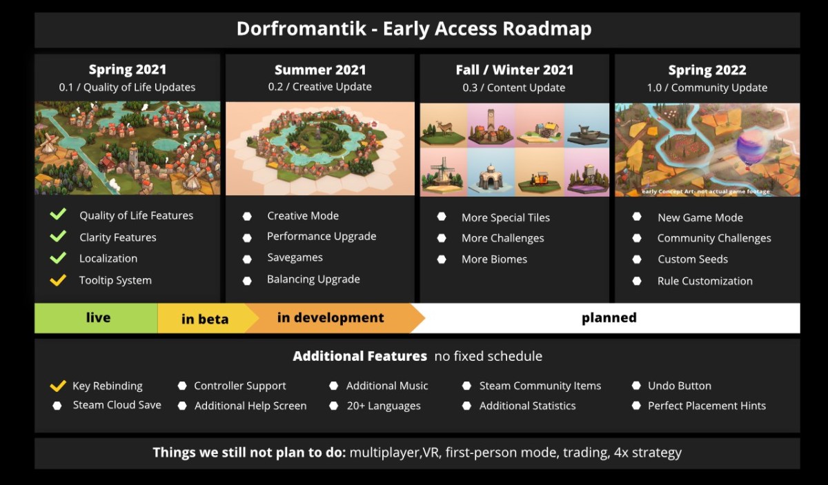Nach dem erfolgreichen Early-Access-Start und den vielen positiven Rückmeldungen soll Dorfromantik größer werden und länger im Early Access bleiben. Eigentlich waren zwei große Inhaltupdates geplant. Nun sollen drei Updates erscheinen. Die Veröffentlichung wurde von Mitte/Ende 2021 auf Frühjahr 2022 verschoben.