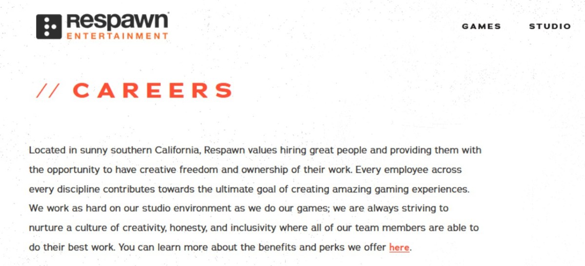 „Wir entwickeln ein brandneues Einzelspieler-Abenteuer von Respawn Entertainment. Wir sind ein kleines, aber ambitioniertes Team mit einer Geschichte, von Großem zu träumen und eine Welle zu machen. Kommt und arbeitet mit uns: