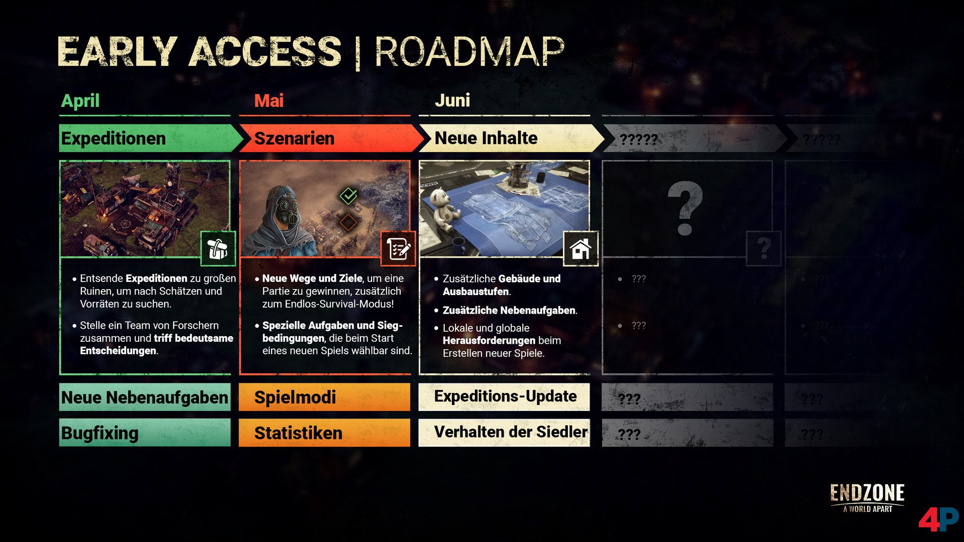 Das nächste Content-Update für Endzone – A World Apart (Early Access) ist veröffentlicht worden. Es umfasst den Szenarien-Spielmodus als Alternative zum endlosen Survival-Modus. Aktuell stehen fünf Szenarien mit besonderen Bedingungen zur Verfügung. Im Szenario „Der lange Sommer“ muss man z.B. mit außergewöhnlich langen Dürreperioden klarkommen. Das Update umfasst außerdem zusätzliche Optionen zur Anpassung des Schwierigkeitsgrads und des Spielstils, umfangreichere Statistiken, ein vertontes Tutorial sowie zwei neue Outlander-Nebenmissionen. Das Change-Log findet ihr hier.