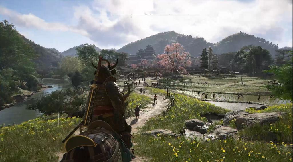 Yasuke reist durch die Stadt Fukuchiyama und wir bekommen zunächst all das zu sehen, was wir von einem Open World-Spiel in Japan erwarten, blühende Kirschbäume, weite Reisfelder, majestätische Tempel. Der Samurai trifft in den Straßen sogar auf einen süßen Akita Inu – und ja, natürlich könnt ihr ihn streicheln! Die Menschen begegnen dem fremdartig anmutenden Mann meist abweisend oder missbilligend – ein Samurai verheißt selten etwas Gutes. Zudem haben die Leute noch nie einen Menschen wie Yasuke, der einst als afrikanischer Diener nach Japan kam, gesehen. Mit seiner kräftigen Statur und der in Asien untypischen Körpergröße überragt er die meisten Einwohner um mindestens einen Kopf.
