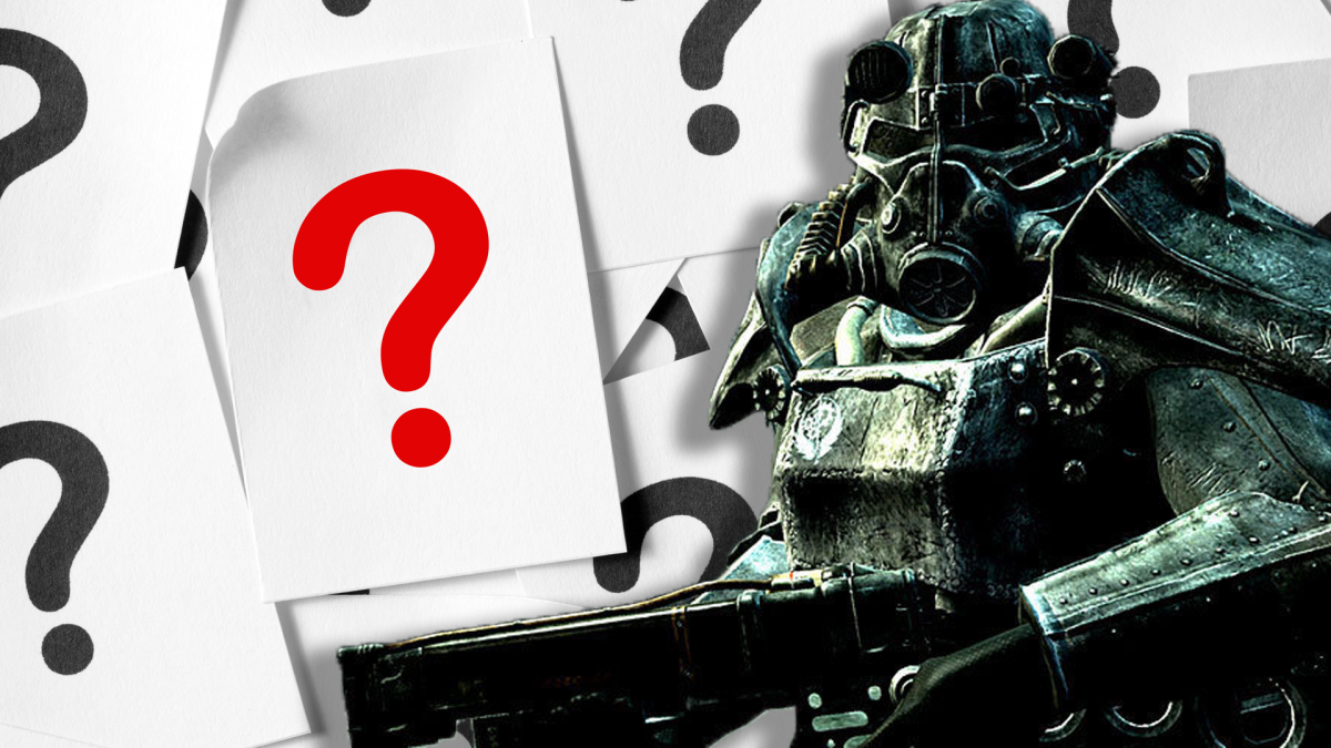 Im Bildvordergrund: Ein Mitglied der Stählernen Bruderschaft gewandet im Power-Anzug. Im Bildhintergrund: Eine wild verteilte Zettelwirtschaft - ein Zettel mit rotem Fragezeichen sticht deutlich hervor.