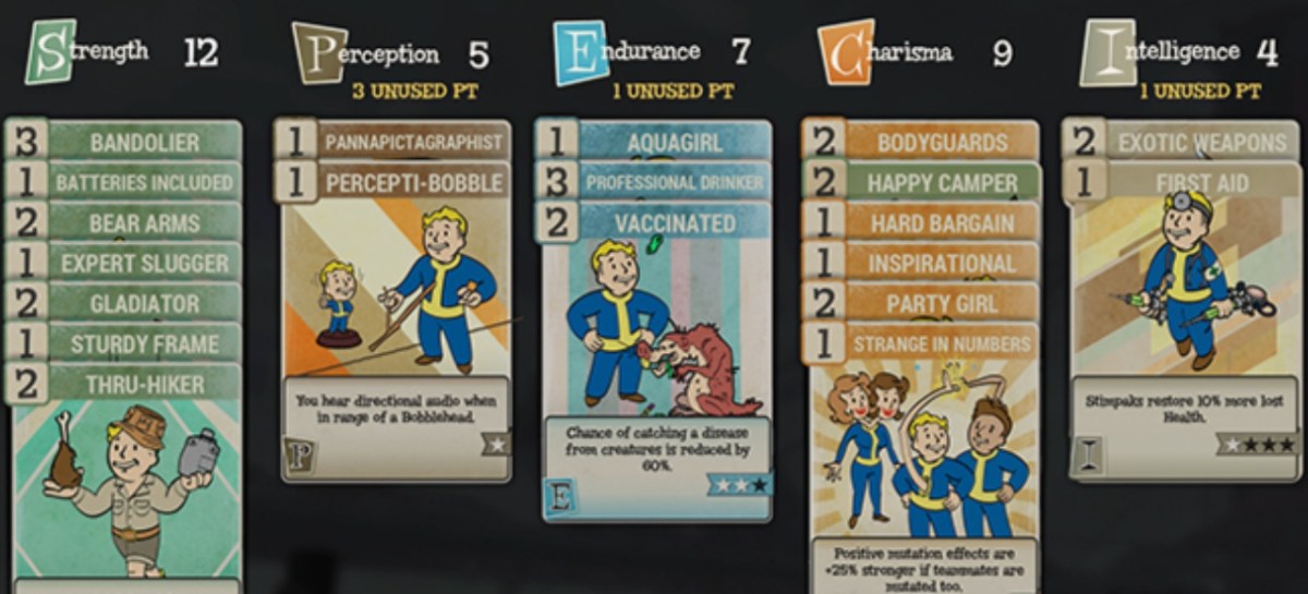 „Die Verbesserung der S.P.E.C.I.A.L.-Werte sorgt nicht nur für spielerische Vorteile, sondern erlaubt auch das Ausrüsten von mehr Skill-Karten der entsprechenden Kategorie. Je mehr Punkte ihr beispielsweise in Stärke habt, desto mehr Stärke-Skill-Karten können aktiv sein. Skill-Karten lassen sich jederzeit ausrüsten und wieder ablegen. Bei jedem Stufenaufstieg könnt ihr eine neue Skill-Karte wählen. Außerdem erhaltet ihr bei bestimmten Stufen-Meilensteinen Pakete, die zufällige Skill-Karten enthalten. Zum Kartenangebot zählen beliebte Klassiker wie ‚Blutiger Tod‘ und Dutzende von neuen Skills, darunter auch auf Charisma basierende Spezialitäten fürs Teamspiel. Wenn ihr doppelte Skill-Karten habt, könnt ihr sie kombinieren, um ihre Stufe und die mit ihnen verbundenen Boni zu erhöhen. Diese höherstufigen Skill-Karten erfordern mehr S.P.E.C.I.A.L.-Punkte als Voraussetzung, aber das ist es wert, wenn ihr dadurch einen besseren Erste-Hilfe-Skill bekommt oder das schmutzige Ödland-Wasser trinken könnt“, schreiben die Entwickler.