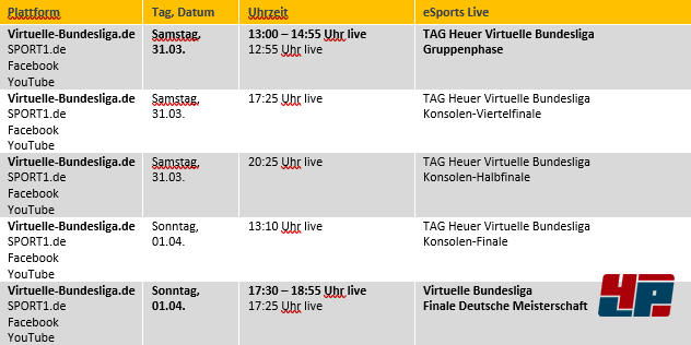 Sport1 überträgt das eSports-Event am Samstag (31. März) und Sonntag (1. April) erstmals auch live im Free-TV. Zudem kann die komplette Veranstaltung, wie bereits im Vorjahr, im (kostenlosen) Livestream auf sport1.de und virtuelle-bundesliga.de verfolgt werden. Durch die Sendung führen die beiden Moderatoren Tobias Wahnschaffe und Konni Winkler. Außerdem werden ihnen die beiden FIFA-Kommentatoren Malte Hedderich und Benny Drexler von bPartGaming zur Seite stehen.