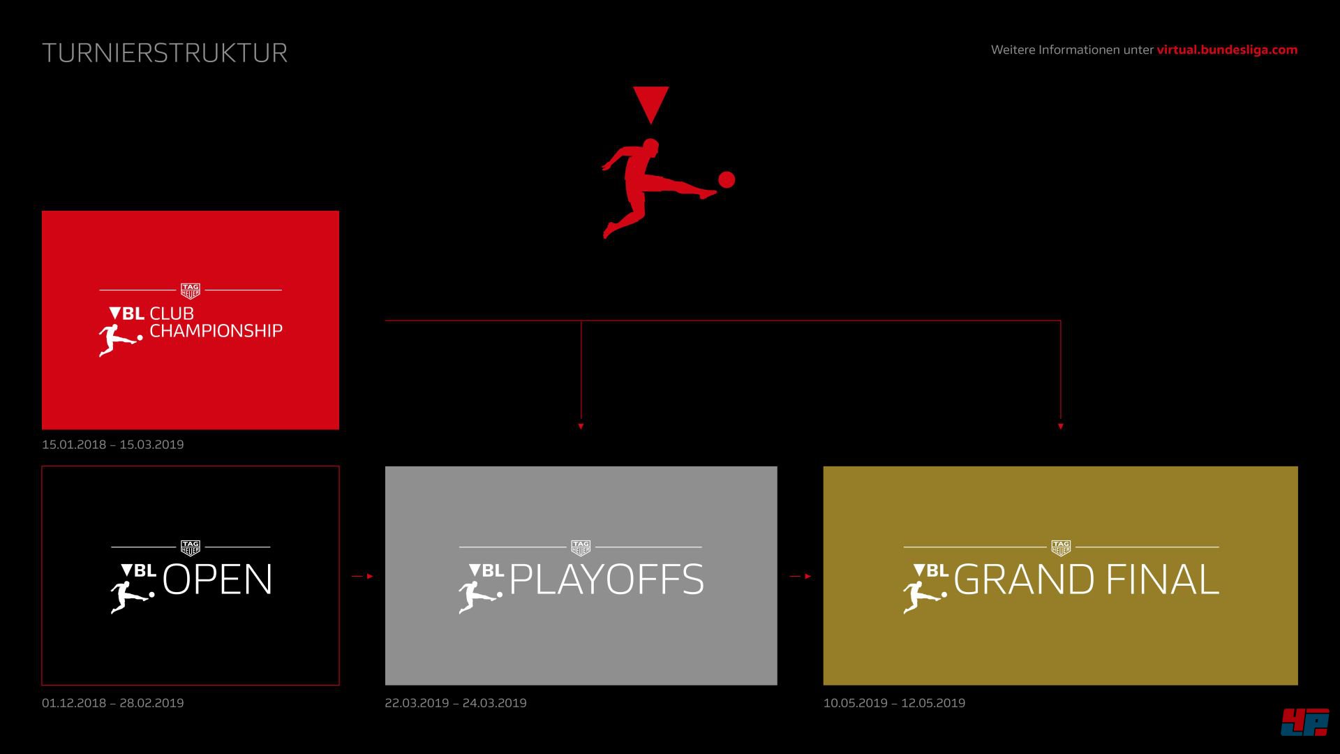 VBL Club Championship: „Eine zusätzliche neue Qualifikationsmöglichkeit für die VBL Playoffs und das VBL Grand Final ist die neu gegründete VBL Club Championship. Jeder Club der Bundesliga und 2. Bundesliga wird eingeladen, einen eigenen Kader zu nominieren. Das Team kann aus mindestens zwei und maximal vier Spielern bestehen. Die Mannschaften spielen dann in einem geschlossenen Ligasystem um den Titel des VBL Club Champion, den Deutschen Club-Meister. Spielern der Top-Teams winkt dabei eine direkte Qualifikation für das VBL Grand Final, während sich weitere Mannschaften für die VBL Playoffs qualifizieren können. Die VBL Club Championship findet von Mitte Januar bis Mitte März 2019 statt.“