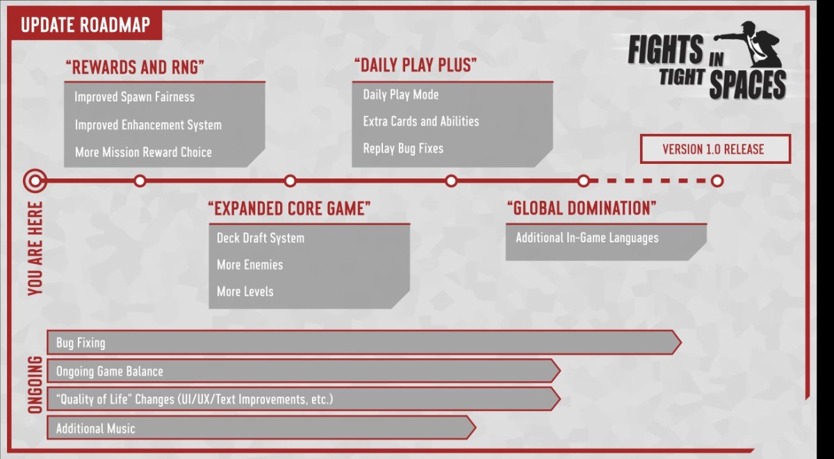 Nach dem Early-Access-Start von Fights in Tight Spaces am 24. Februar 2021 haben Ground Shatter und Mode 7 den ersten Fahrplan für die Early-Access-Updates bekanntgegeben. Das rundenbasierte Taktikspiel mit Karten- und Deckbau-Elementen soll in weniger als einem Jahr fertiggestellt werden.