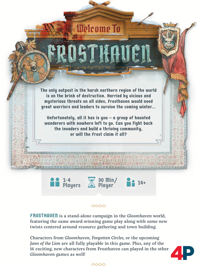 Das erfolgreiche Brettspiel Gloomhaven bekommt mit Frosthaven eine eigenständige Kampagne als Nachfolger spendiert, die im „eisigen Norden der Spielwelt“ angesiedelt ist. Laut Isaac Childres (Cephalofair Games) wird sich das Spielgeschehen weitgehend an Gloomhaven orientieren, aber einige Neuerungen beim Stadtaufbau und dem Sammeln von Ressourcen mit sich bringen. Auch einige bekannte Regeln wurden überarbeitet. Neue (saisonale) Ereignisse, Gegner und Rätsel werden zudem versprochen. Charaktere aus Gloomhaven, Forgotten Circles und Jaws of the Lion (noch nicht veröffentlichte Light-Version) können ebenfalls in Frosthaven gespielt werden. Die 16 neuen Frosthaven-Charaktere dürfen ihr Glück ebenso in Gloomhaven versuchen.