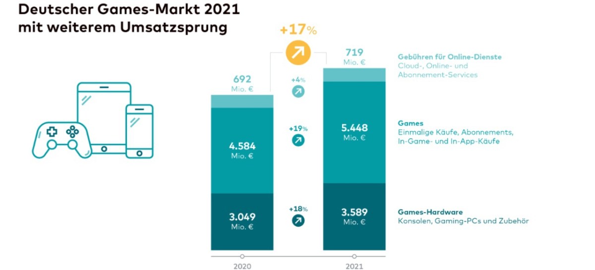 game, der Verband der deutschen Gamesbranche, hat gute Zahlen für den heimischen Daddelmarkt ermittelt und veröffentlicht. Laut game wurde „2021 mit Games, Gebühren für Online-Dienste sowie Games-Hardware rund 9,8 Milliarden Euro umgesetzt. Das ist ein Plus von 17 Prozent im Vergleich zum Vorjahr.“