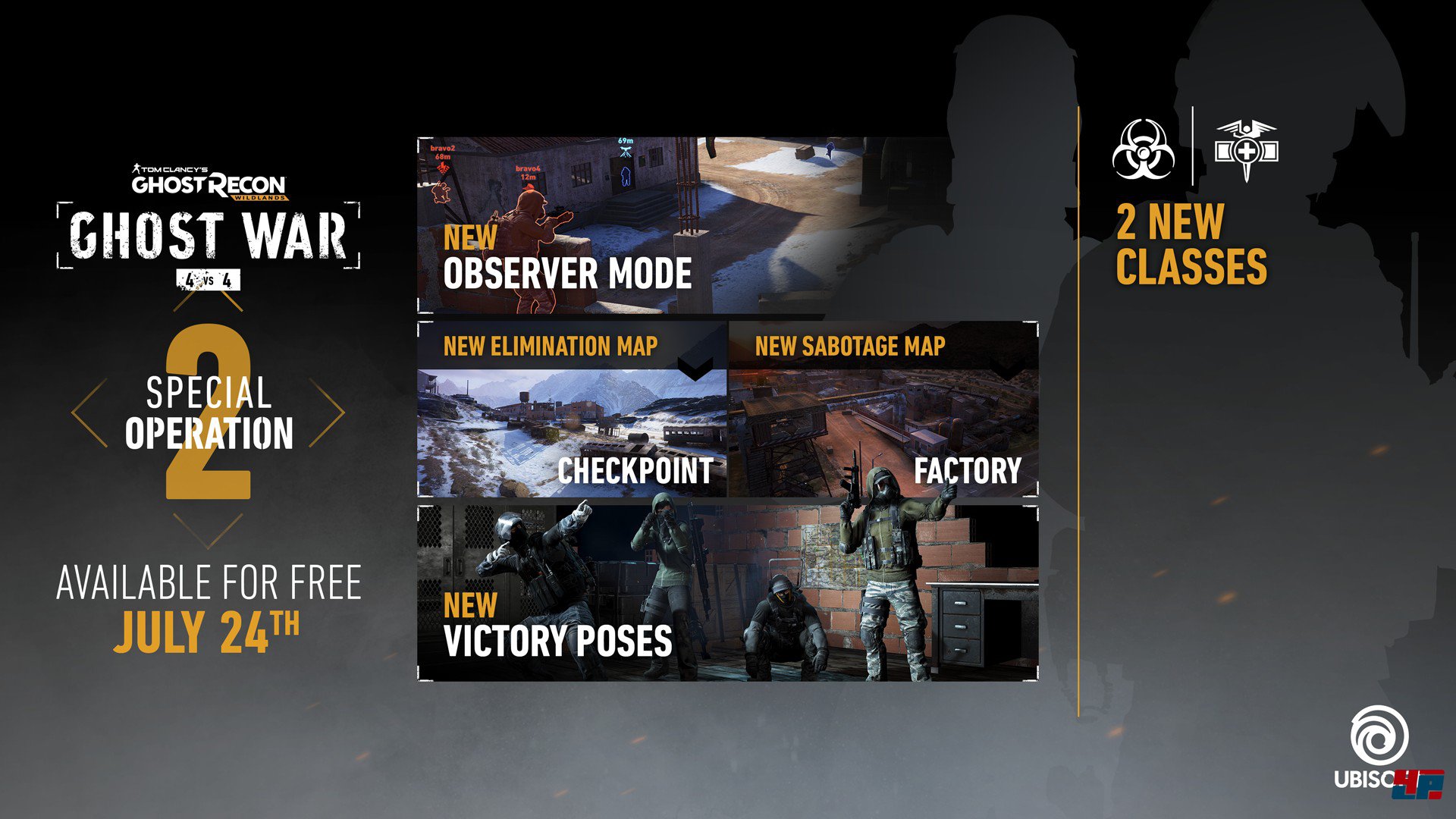 Ubisoft hat die Special Operation 2 für Ghost Recon Wildlands angekündigt. Das zweite große und kostenlose Update im zweiten Jahr nach dem Release wird ab dem 24. Juli 2018 auf PC, PlayStation 4 und Xbox One. Das Update umfasst eine neue „PvE-Erfahrung“ (gegen Computergegner), Neuerungen für den Ghost War PvP-Modus sowie das folgende, von der Community gewünschte Feature: einen Permadeath PvE-Spielmodus namens Ghost Mode.