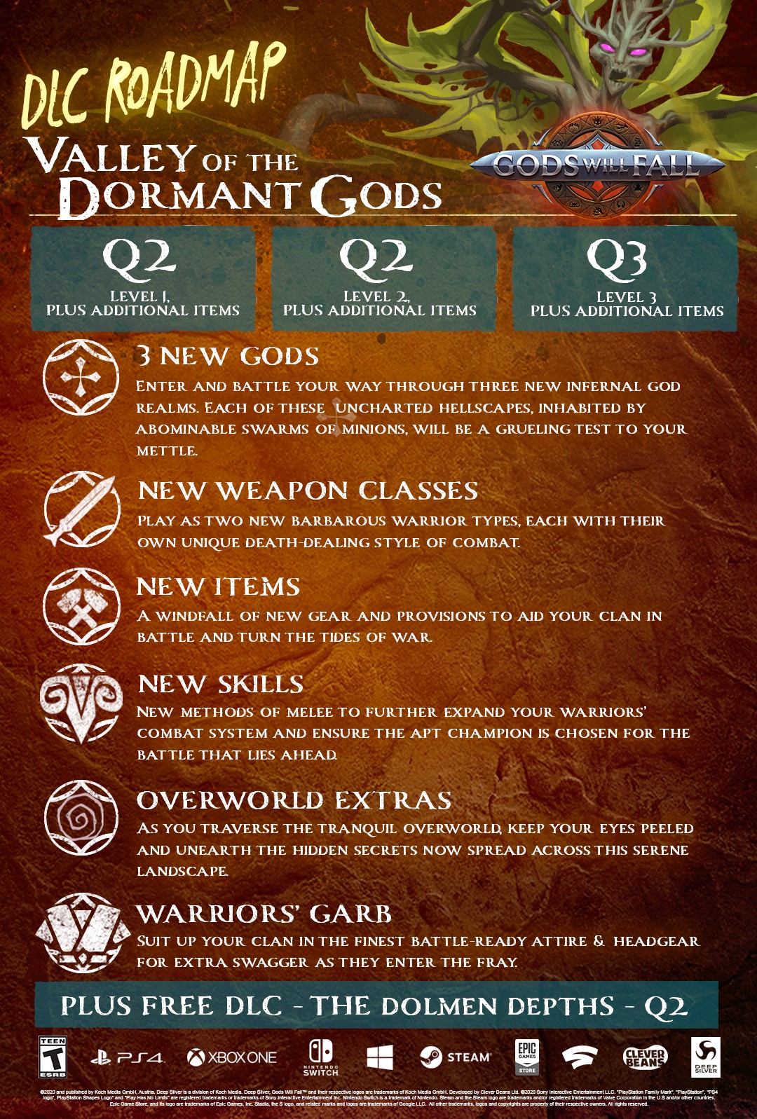 Im zweiten Quartal dürfen sich alle Besitzer des Spiels über ein Geschenk in Form des kostenlosen DLC ‚Dolmen Depths‘ freuen, in dem man eine mysteriöse Unterwelt erforschen und einen seit langer Zeit verschollenen Krieger aus dem Jenseits befreien muss, der sich bei Erfolg der eigenen Truppe anschließt. Dies wird aber kein leichtes Unterfangen, denn in diesem brandneuen, prozedural generierten Dungeon wimmelt es nur so vor grausigen Feinden, die mit aller Macht versuchen, die Toten dort zu behalten, wo sie hingehören.“
