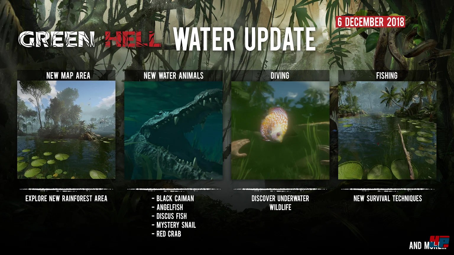 Für die Early-Access-Version von Green Hell ist das große Water Update bei Steam erschienen. Es umfasst einen neuen Kartenabschnitt und diverse Tiere, darunter Skalare, Diskusfische, den schwarzen Kaiman, „Mysterienschnecken“, Garnelen und die rote Krabbe. Neben neuen Pflanzen und Fallen kommt ein Angel-System (Angelruten herstellen, Fische fangen) ins Spiel. Auch Schwimmen und Tauchen kann man fortan.