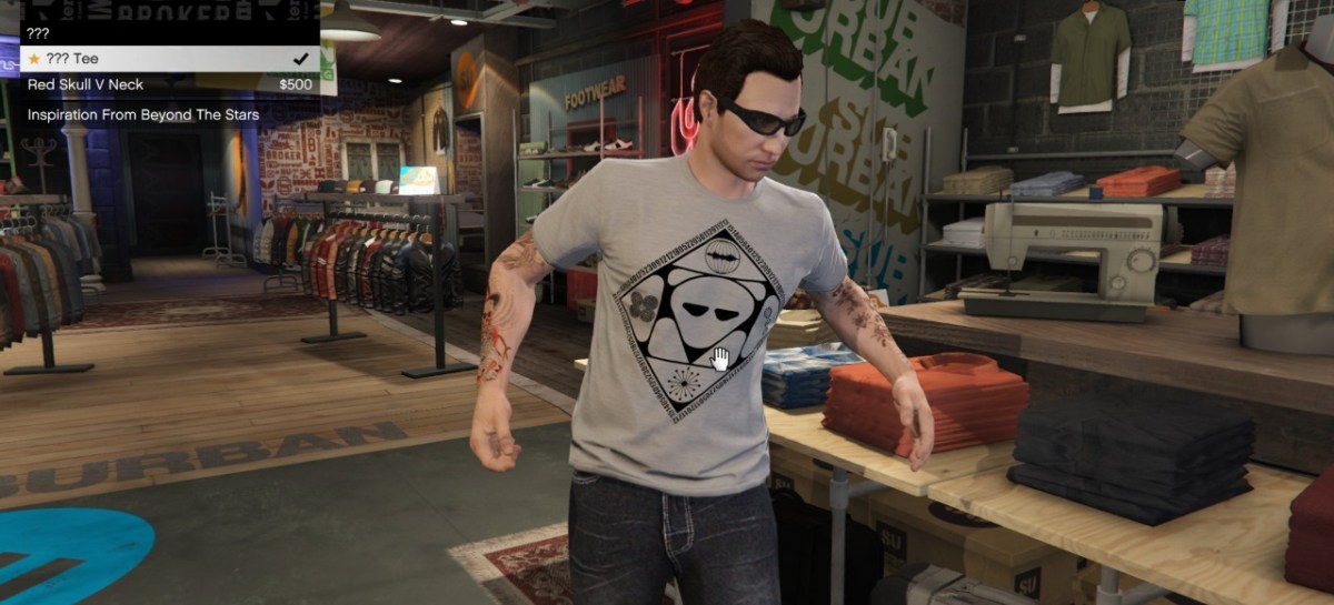 Wie GTANet über Twitter erklärt, handelt es sich dabei um ein Shirt, welches unter der Kategorie mit dem Namen „GTA V Anniversary“ zu finden war. Kurioserweise trägt es auch noch den eher wenig aussagekräftigen Namen „??? Tee“, während auf seiner Front ein paar schwer definierbare Symbole rund um eine Art Alien-Kopf prangen. In einem Karo rund um die Symbole ist ein längerer Zahlencode erkennbar, der dank eines Dechiffrier-Tools kurzerhand entschlüsselt werden konnte: „ONEDAYWILLREVEALALL“, zu Deutsch: “Eines Tages wird alles enthüllt“.