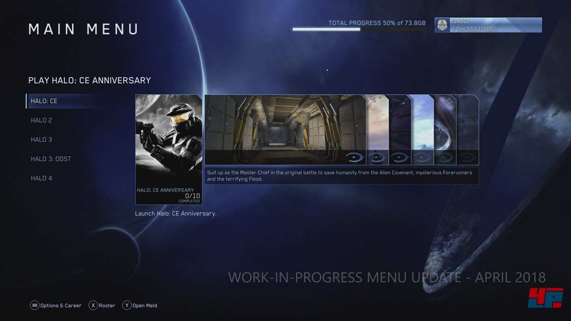 Im „Sommer 2018“ soll ein großes Update für Halo: The Master Chief Collection erscheinen. Mit dem Update sollen zahlreiche Verbesserungen vorgenommen und viele Fehler beseitigt werden (Quelle). Abgesehen von zahllosen Bugfixes wird an einer intelligenten Update-Funktion und Textur-Streaming (schnellere Ladezeiten; ca. 35 bis 40 Prozent bei Mehrspieler-Karten) gearbeitet. Außerdem soll die Menüstruktur komplett verändert und der Hauptbildschirm zum Beispiel auf ein vertikales Menü umgestellt werden (siehe unten). HDR- und SDR-Einstellungen (SDR=Gamma) zur Kalibrierung und LAN-Unterstützung werden implementiert.