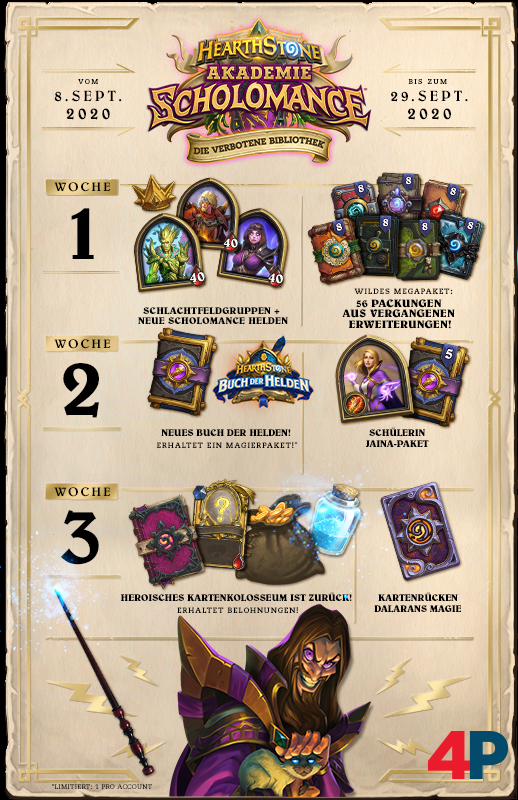 „Das heroische Kartenkolosseum ist wieder da. Spieler erstellen ein Deck aus ihrer eigenen Sammlung und treten dann gegen andere Herausforderer an, bis sie entweder drei Spiele verloren oder 12 Spiele gewonnen haben. Anschließend erhalten sie Belohnungen basierend auf der Anzahl gewonnener Spiele. (…) Das Schülerin Jaina-Paket mit dem Heldenskin Schülerin Jaina sowie 5 Magierpackungen ist vom 15. bis zum 22. September erhältlich. Außerdem gibt es vom 22. bis zum 29. September den Kartenrücken Dalarans Magie, der zuvor nur im Juni 2017 als saisonale Belohnung freigeschaltet werden konnte.“