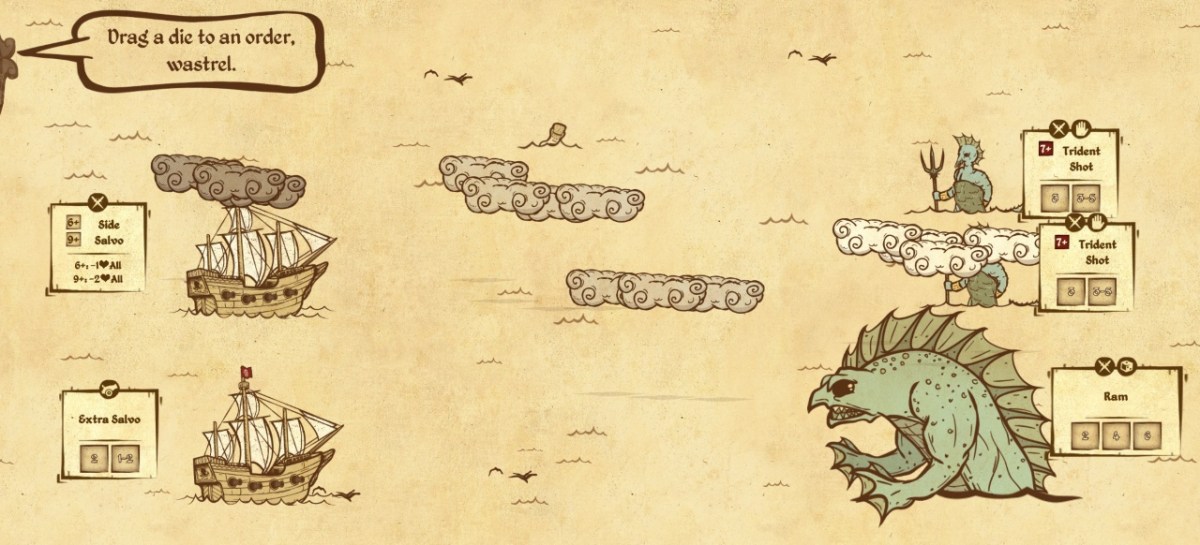 Seit August letzten Jahres ist dort verfügbar und erlaubt rundentaktische Gefechte gegen die Monster der See. Der Einsatz der richtigen Aktionen sowie Würfelglück entscheiden dabei über Sieg oder Niederlage und wie das aussehen kann, zeigen die nachfolgenden Spielszenen. Abgesehen davon schlägt man sich mit problematischen Anweisungen bürokratischer Landratten herum und verstärkt die eigene Mannschaft mit den individuellen Fähigkeiten neuer Crew-Mitglieder.