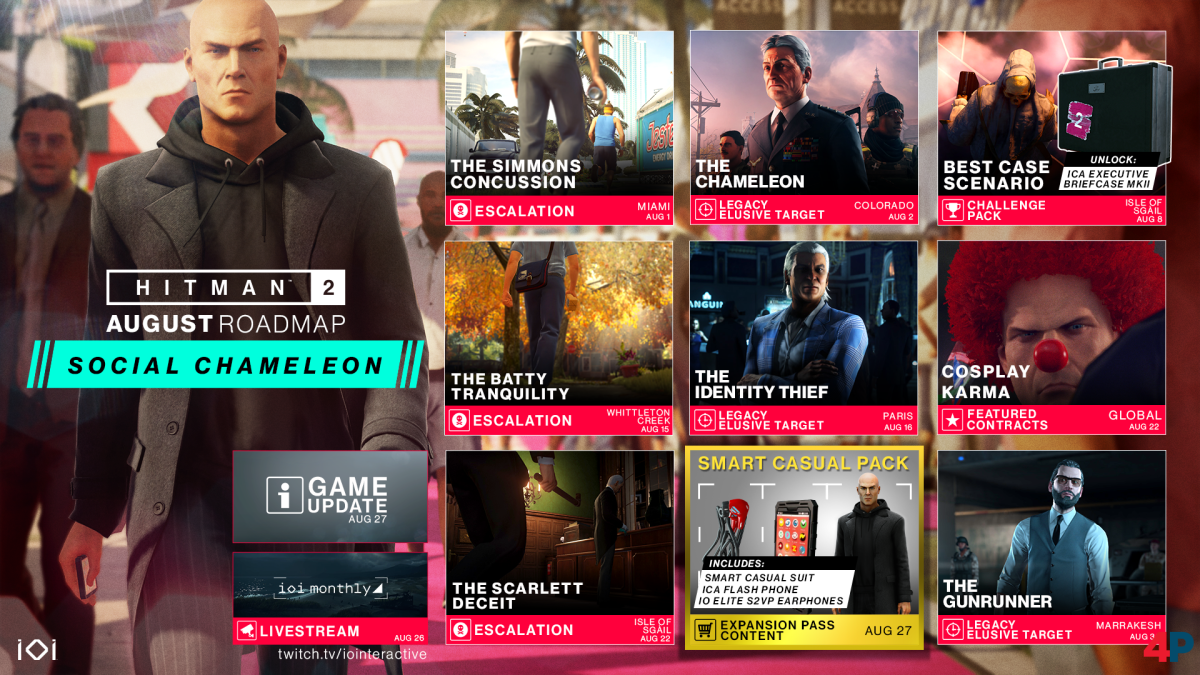 Ansonsten gibt es im August die gewohnte Hitman-Mischung aus Elusive Targets, Escalation Contracts und einem Spiel-Update (am 27. August). Expansion-Pass-Besitzer erhalten am 27. August noch Zugang zum „Smart Casual Pack“.