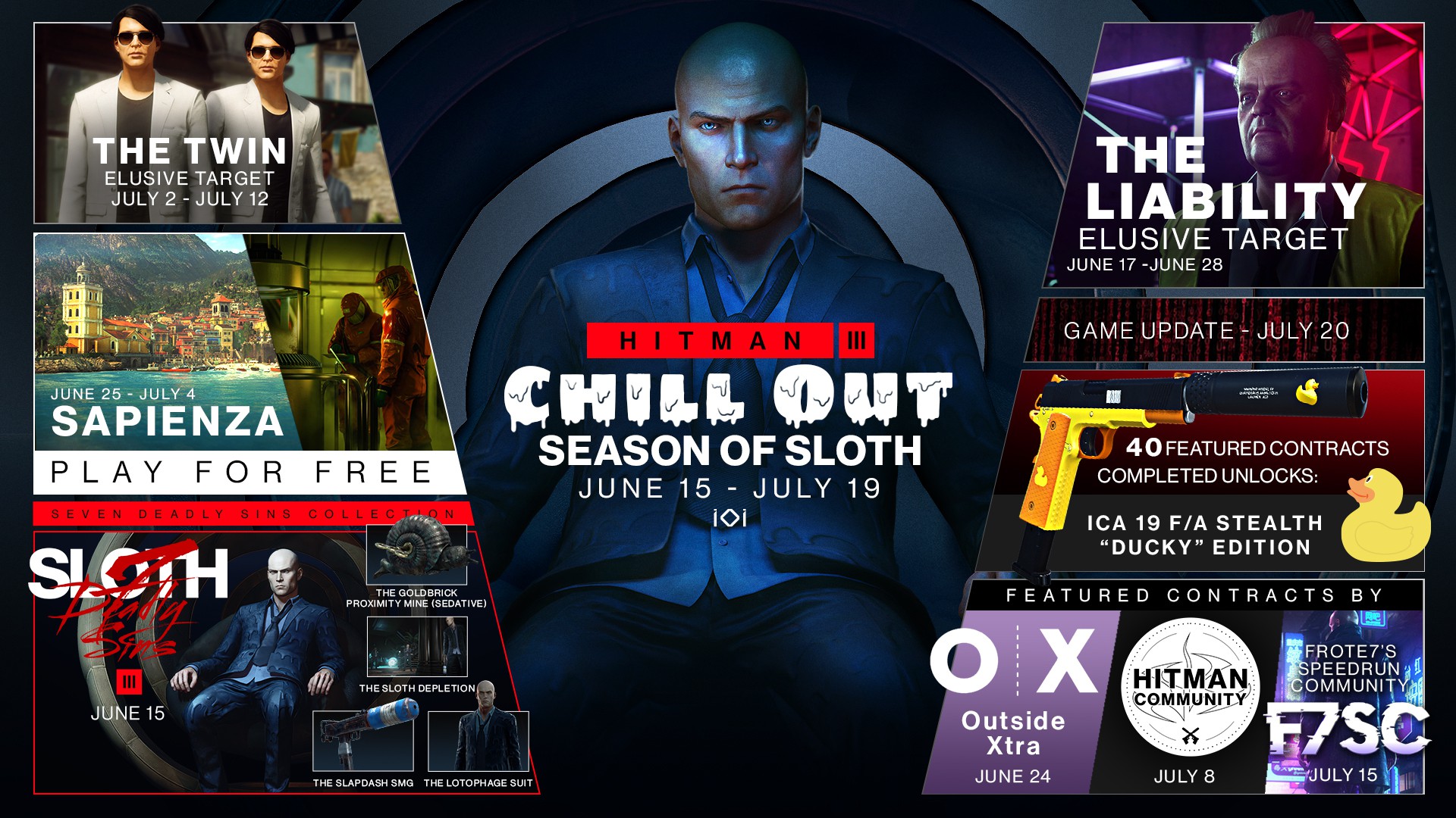 Die (kostenlosen) Live-Inhalte von Hitman 3 werden ebenfalls im Rahmen der „Seasons of Sin“ veröffentlicht. Die „Season of Sloth“ wird noch bis zum 19. Juli dauern. Regelmäßige und kostenlose neue Inhalte für alle Besitzer des Spiels werden versprochen, z.B. Eskalationen, besondere Aufträge, saisonale Events und (auch neue) schwer fassbare Ziele. Hierzu gehört z.B. das nächste Elusive-Target in Berlin – vom 17. Juni bis 28. Juni.