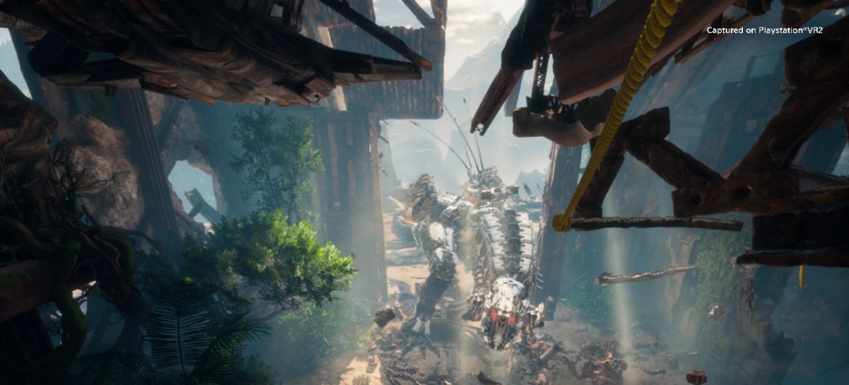 Während sich die Perspektive und der Spielcharakter verändern, betritt Horizon Call of the Mountain ansonsten vertrautes Terrain. Die grafisch beeindruckende Welt verlockt noch immer mit tropischen Wäldern, plätschernden Bächen und hohen Bergen und auch die Roboter-Dinosaurier samt Langhälsen und Brüllrücken sind mit von der Partie.