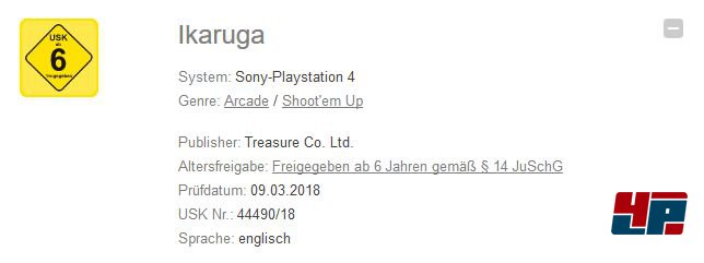 Den Kollegen von Gematsu ist ein USK-Eintrag zu Ikaruga aufgefallen, der auf eine kommende Veröffentlichung des vertikal scrollenden Shoot’em-Up-Klassikers auf PlayStation 4 hindeutet. In einem Prüfbericht der USK vom 9. März 2018 wurde einer von Treasure eingereichten PS4-Version jedenfalls eine Altersfreigabe ab 6 Jahren erteilt: