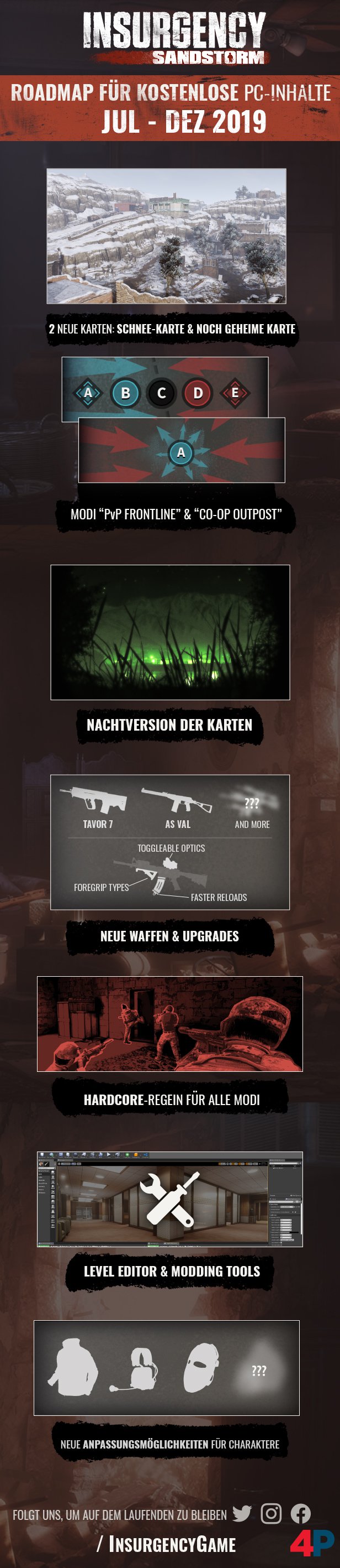 Der Multiplayer-Shooter Insurgency: Sandstorm soll in den nächsten sechs Monaten mit weiteren, kostenlosen Inhalten versorgt werden. Geplant sind zwei neue Karten (darunter eine Schnee-Karte), Nacht-Versionen von Karten inkl. entsprechender Nachtausrüstung und Hardcore-Regeln für alle Spielmodi.