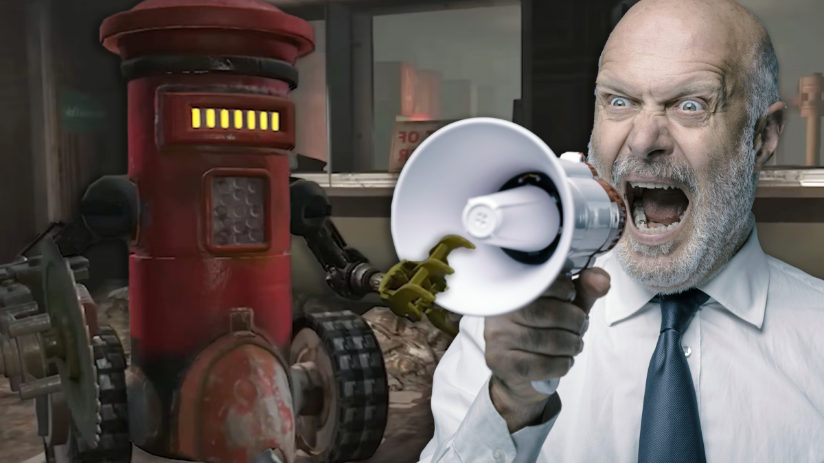 Im Hintergrund: eine Spielszene aus der Fan-Mod Fallout London. Im Vordergrund: Ein Mann, der in ein Megafon brüllt.