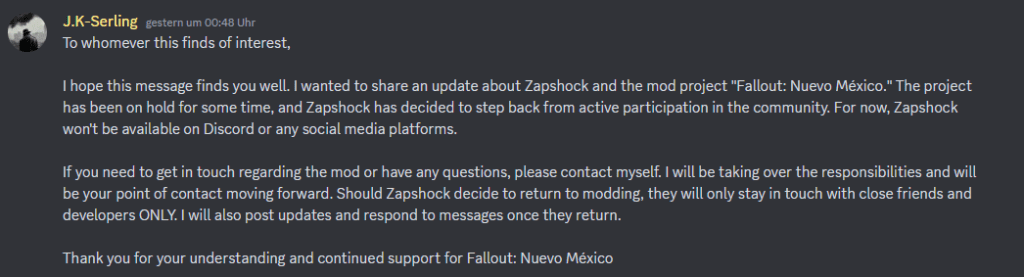 So schreibt J.K. Serling, Head of Public Relations, auf dem Discord-Server, was sich viele schon gedacht und befürchtet hatten. Das Projekt Fallout: Nuevo México liegt vorerst auf Eis; das Team von Zapshock habe beschlossen, keine Interaktion mit der Community vorzunehmen und wird auf Discord wie auch in den sozialen Medien nicht erreichbar sein.