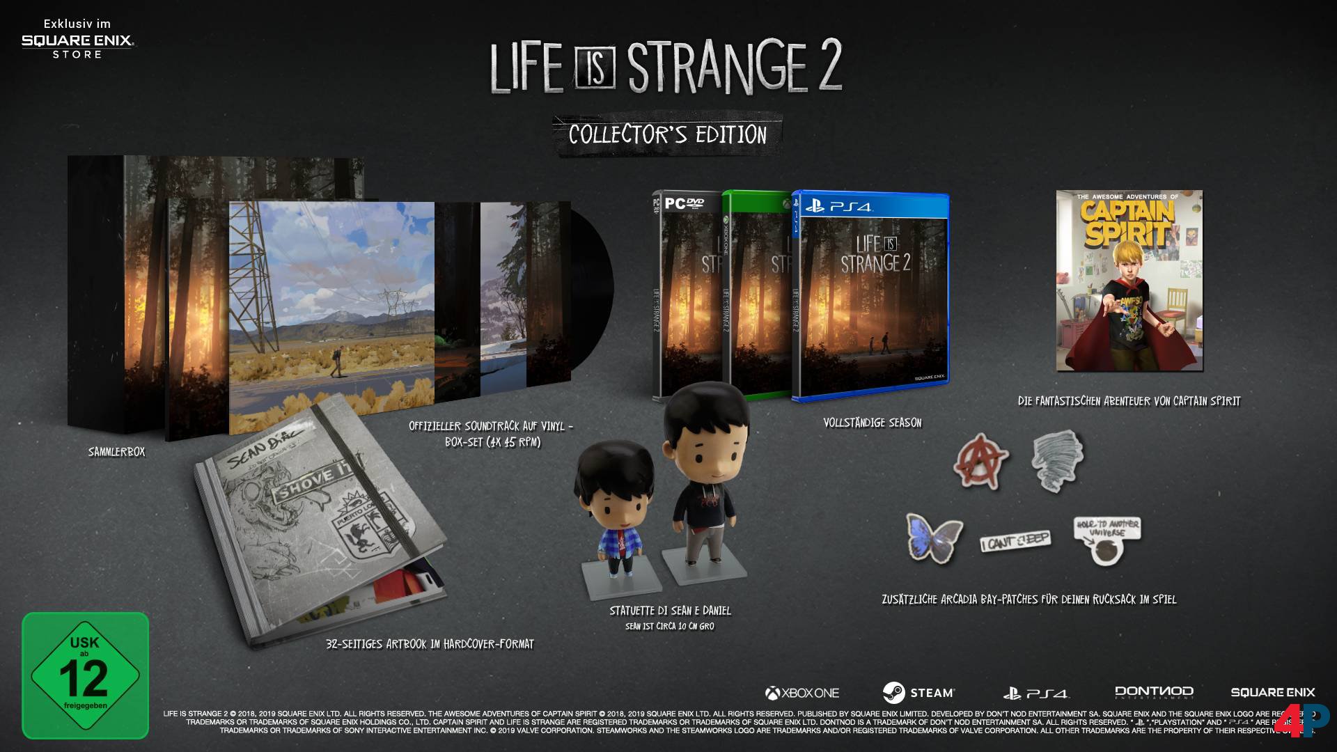 Die limitierte Collector’s Edition für 69,99 Euro ist nur im Square Enix Store erhältlich. Sie umfasst die vollständige Season, das Bonus-Spiel „The Awesome Adventures of Captain Spirit“, Arcadia-Bay-Aufnäher für Seans Rucksack im Spiel, den Soundtrack von Jonathan Morali auf Vinyl (4 x 45rpm), ein 32-seitiges Artbook im Hardcover-Format mit Concept-Art aus dem Spiel, Vinyl-Figuren von Sean (ca. 10 cm groß) und Daniel (ca. 7,5 cm groß) und die Collector’s-Edition-Sammlerbox.