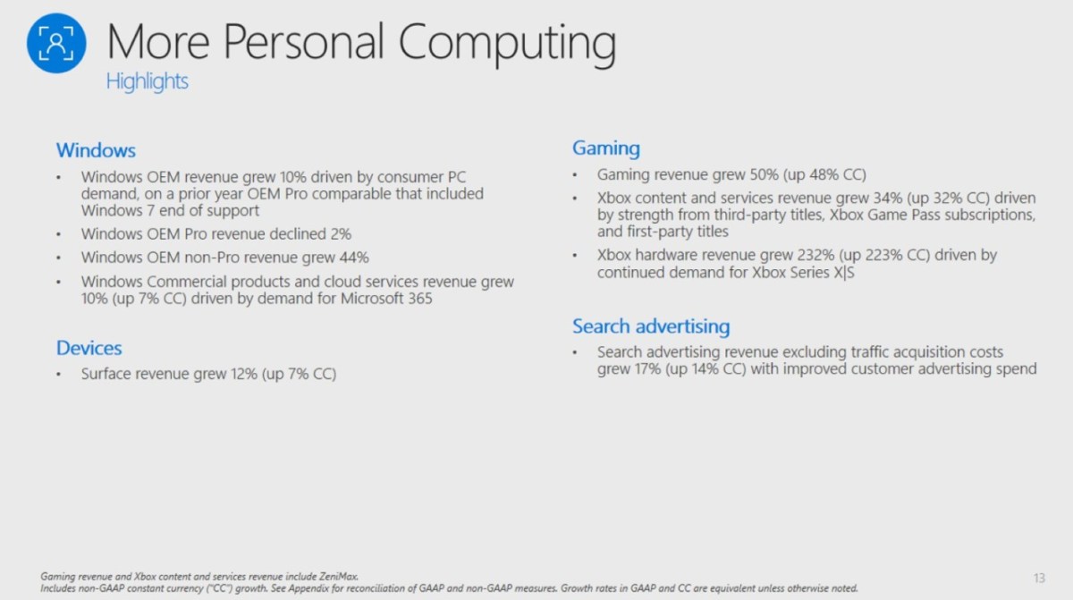 Die Einnahmen mit Xbox-Inhalten und -Diensten legten um 34 Prozent zu, angefeuert durch Third-Party-Titel (Spiele, die nicht von Microsoft selbst vertrieben werden), die Xbox-Game-Pass-Abonnenten und First-Party-Titel (Spiele von den Xbox Studios). Konkrete Spiele-Titel wurden nicht erwähnt. Aktuelle Game-Pass-Abonnentenzahlen wurden ebenfalls nicht genannt. Die letzten Gerüchte besagten 23 Millionen. Der Bereich Xbox-Inhalte und -Dienste ist insgesamt für ca. 80 Prozent des Gesamtumsatzes der Gaming-Sparte verantwortlich.