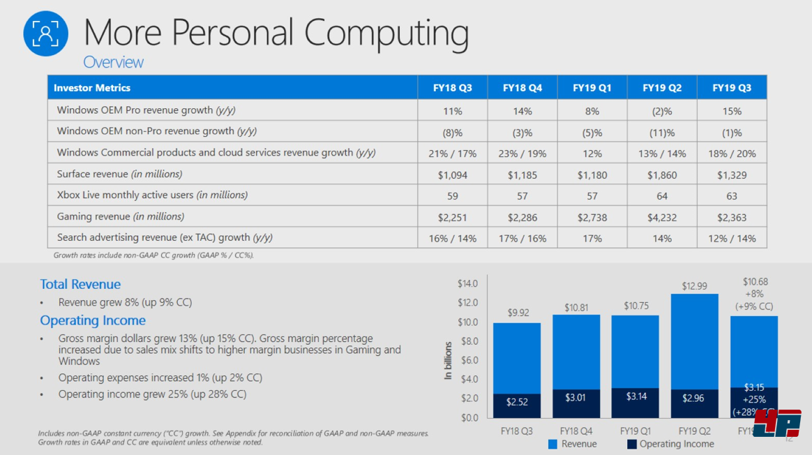 Microsoft hat den Geschäftsbericht für den Zeitraum Januar 2019 bis März 2019 vorgelegt. Die Umsätze im Gaming-Bereich stiegen im Vergleich zum Vorjahr um fünf Prozent auf 2,363 Mrd. Dollar. Der gestiegene Xbox-Software-Absatz konnte schwächelnde Hardware-Verkaufszahlen kompensieren. Die Einnahmen der Sparte Xbox Software und Services stieg um 12 Prozent – hauptsächlich durch die Monetarisierung von Third-Party-Spielen (Nicht-Microsoft-Spiele) und steigende Abonnentenzahlen; höchstwahrscheinlich ist der Xbox Game Pass gemeint. Die Anzahl der „monatlich aktiven Nutzer“ von Xbox Live stieg um sieben Prozent auf 63 Millionen (Vorjahr: 59 Millionen). Genauere Angaben machte das Unternehmen nicht.