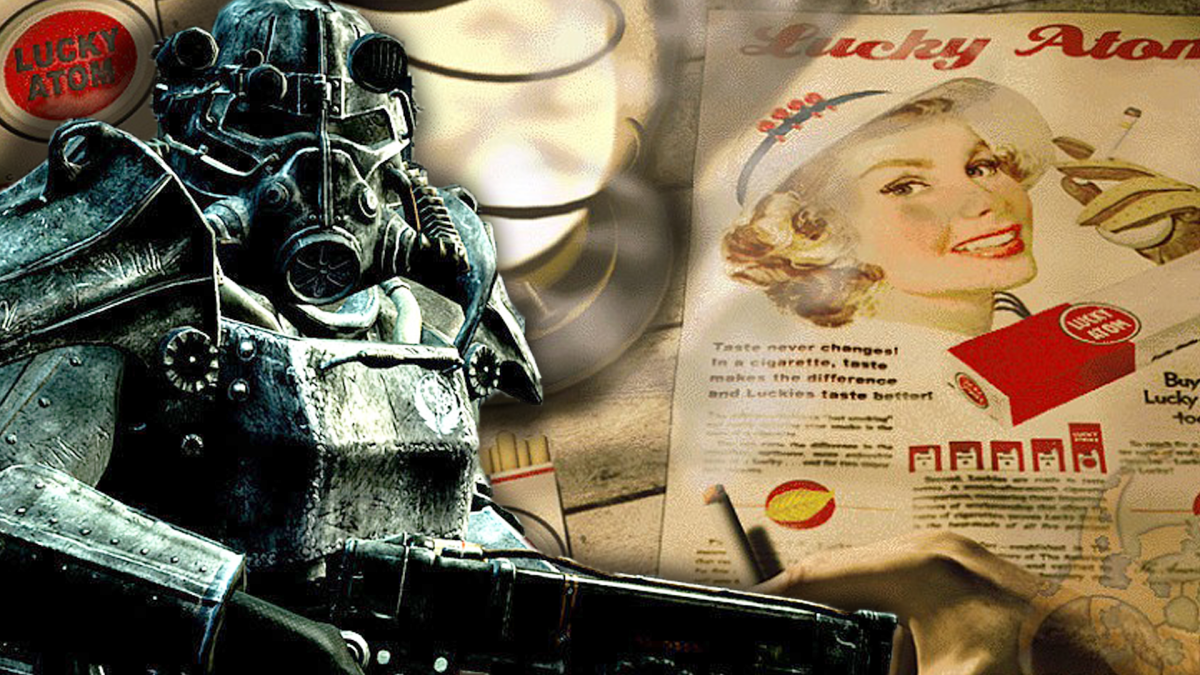 Ein Mitglied der Stählernen Bruderschaft gekleidet im Power-Anzug. Hinter dem Stählernen sehen wir eine fiktionale Zigarettenwerbung aus der Fan-Mod Fallout 1.5.