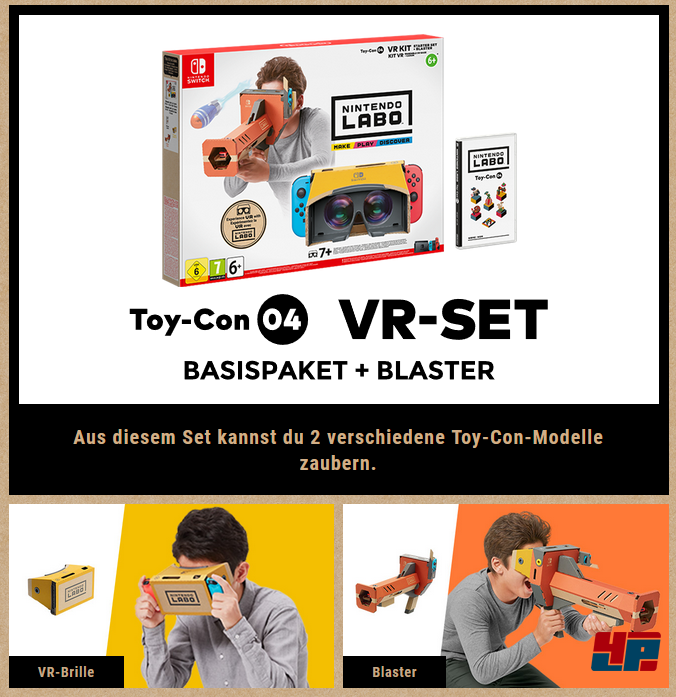 Darüber hinaus gibt es das Nintendo Labo: VR-Set – Basispaket + Blaster. Es beinhaltet die Nintendo-Switch-Software sowie alle Komponenten für die Toy-Con-VR-Brille und den Toy-Con-Blaster. Außerdem sind eine Bildschirmhalterung und eine Abdeckung mit dabei. Wer das Basispaket besitzt, kann die zwei optionale Erweiterungspakete erwerben. Erweiterungspaket 1 mit Toy-Con-Elefant und Toy-Con-Kamera sowie Erweiterungspaket mit Toy-Con-Windpedal und der Toy-Con-Vogel.