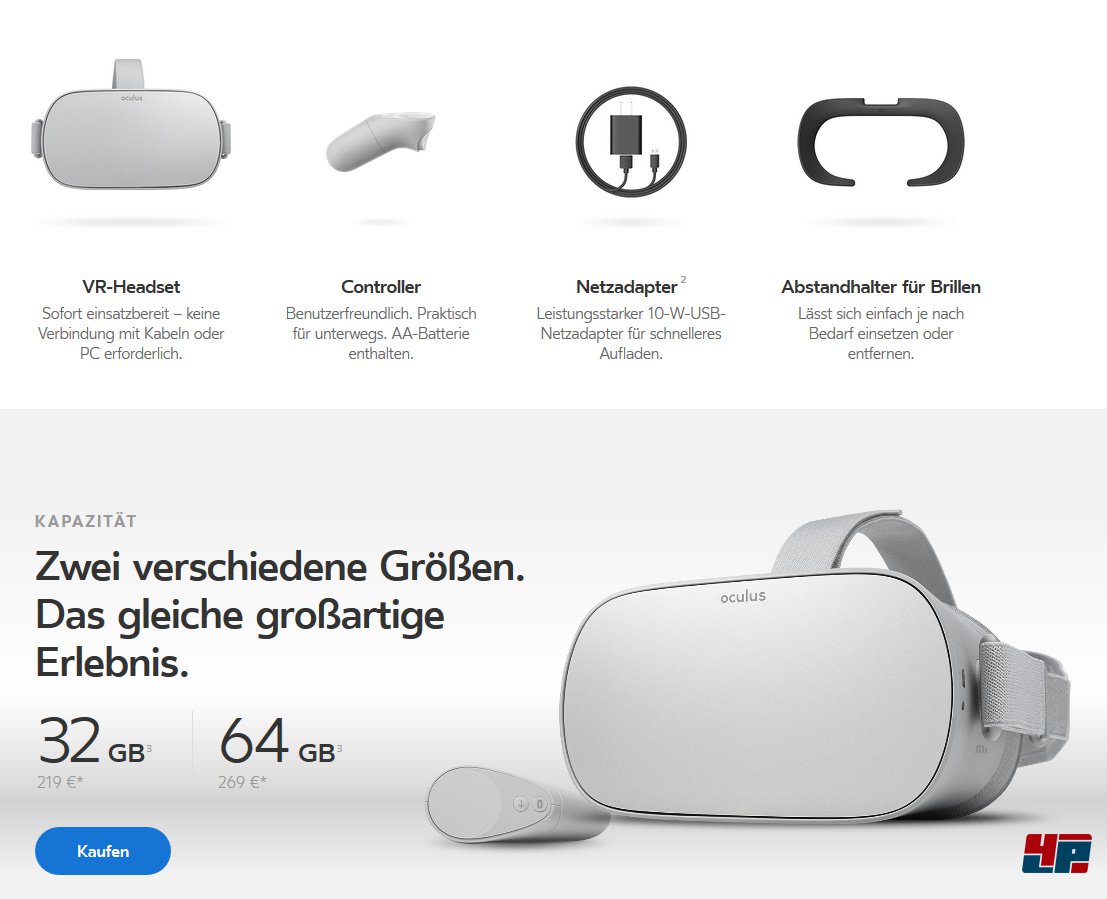 Facebook will es neuen VR-Interessierten leicht machen: Das am Mittwoch veröffentlichte autarke Virtual-Reality-Headset Oculus Go kostet lediglich 219 Euro (mit 32GB; 269 Euro mit 64 GB; zur offiziellen Website) und besitzt einen eingebauten Rechenchip, so dass kein externer Rechner und keine Kabel mehr nötig sind. Im Gegensatz zu Bausätzen wie Samsung Gear VR muss man auch kein Handy in die Front schieben, da der mit LCD-Bildschirm mit einer Auflösung von 2560 x 1440 bereits eingebaut ist (zum Vergleich: beim für 2018 geplanten Konkurrenzsystem Vive Focus sind es insgesamt 2.160 x 1.200 Pixel, beim neuen Premium-Headset Vive Pro 2.880 x 1.600 Pixel).