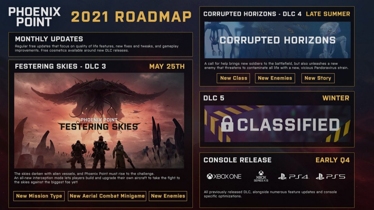 Die Entwickler von Phoenix Point haben ihren Plan für das laufende Jahr bekanntgegeben. Demnach soll die dritte Erweiterung „Festering Skies“ am 25. Mai erscheinen. Dieser Zusatzinhalt wird neue Missionen und das Luftkampf-Minispiel in Anlehnung an das ursprüngliche X-COM enthalten (Abfangen von Alien-Luft-/Raumschiffen). Außerdem soll der Behemoth als bisher größter Gegner auf dem Schlachtfeld auftauchen. Ende des Sommers soll die vierte Erweiterung „Corrupted Horizons“ mit einer neuen Klasse, weiteren Gegnern und zusätzlichen Story-Elementen folgen. Der fünfte DLC ist für den Winter vorgesehen. Details wurden nicht verraten. An den monatlichen Updates mit Bugfixes, Balance-Anpassungen und Verbesserungen will Snapshot Games weiterhin festhalten.